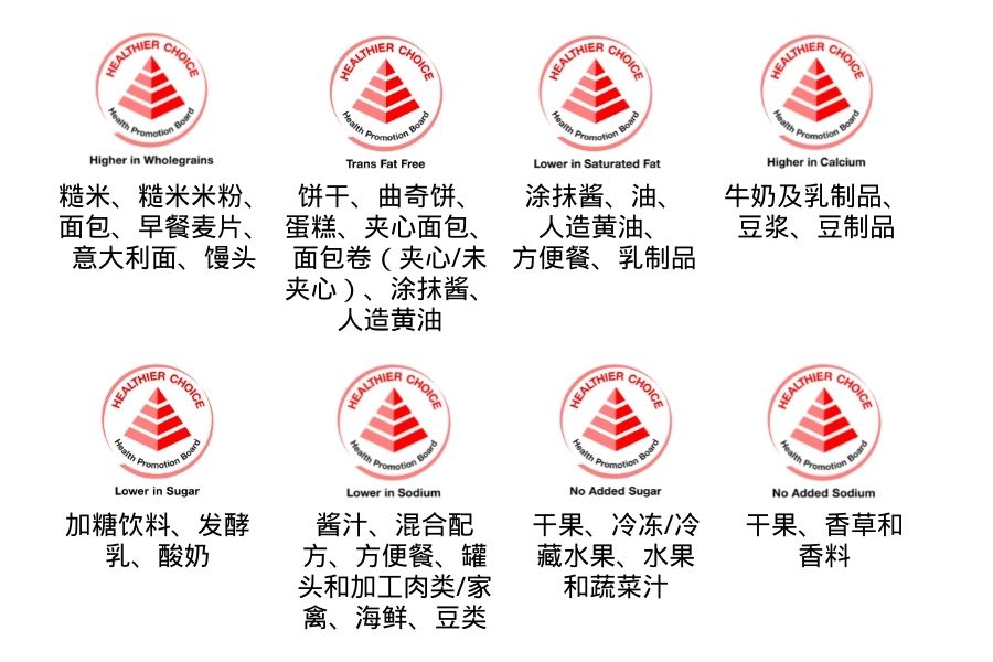 符合保健促进局规定的营养标准的产品被授予“较健康选择标志”(Healthier Choice Symbol, HCS)。与同类食品相比,有“较健康选择标志”的产品含有较低的钠、糖和饱和脂肪,或是更多全谷物、膳食纤维和钙。有“不含反式脂肪”标志的产品不含反式脂肪,或含有很少量的反式脂肪(每100克产品少于0.5克)
