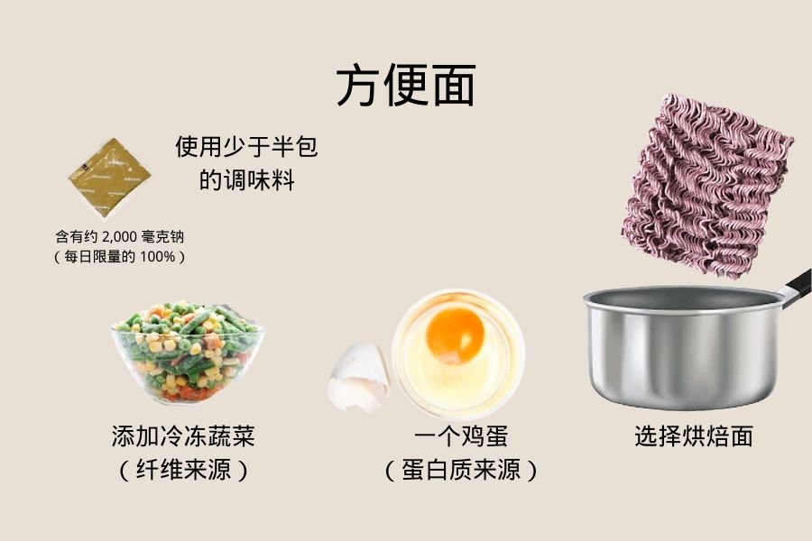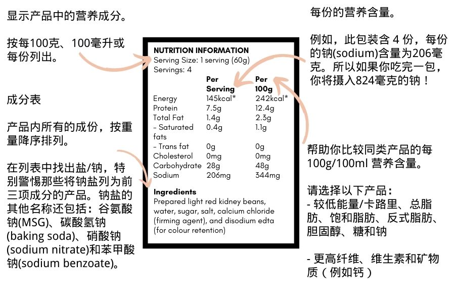 如果选择有限(如:罐头食品浸泡在盐水/糖浆中),您可排干盐水/糖浆,或丢弃盐水/糖浆,以减少糖和盐的含量。