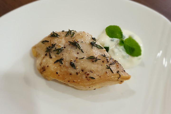 - 将烤熟的鸡胸肉放置于盘子,酸奶酱倒在旁边。