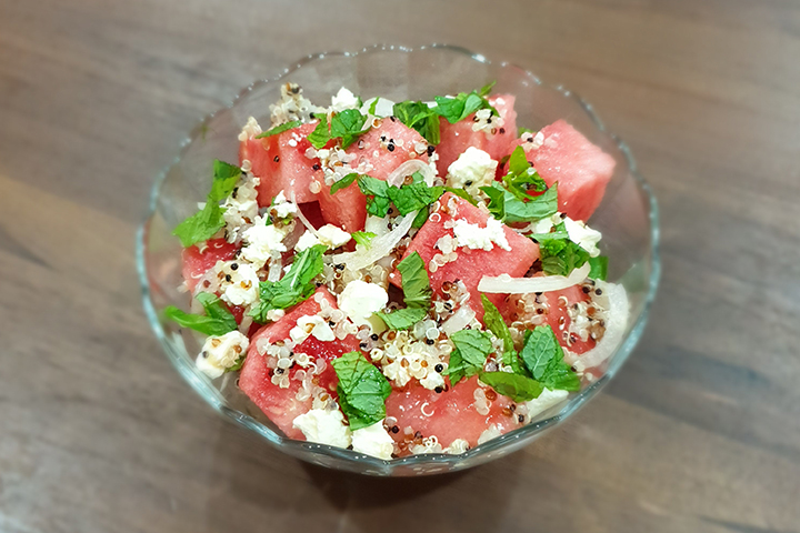 - 食用前,加入西瓜和之前所备的调料。轻轻搅拌藜麦,在上面撒上菲达芝士和香料。