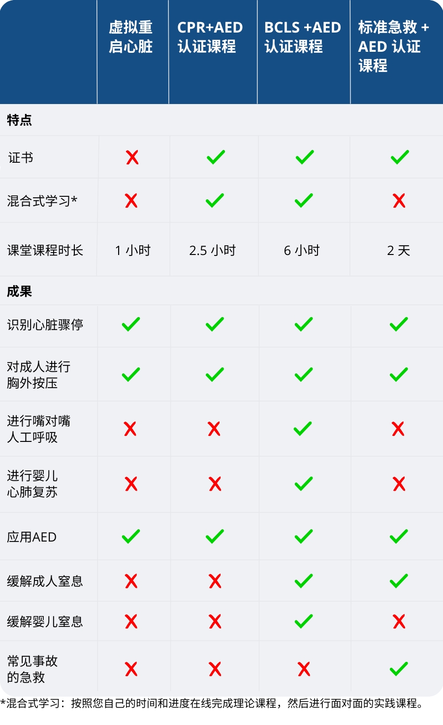 我们的 BCLS+AED 和 CPR+AED 认证课程是市场上最物超所值的课程。此外,这两门课程的混合式学习模式也将上课时间减少了一半,是忙碌职场人士的最佳选择。