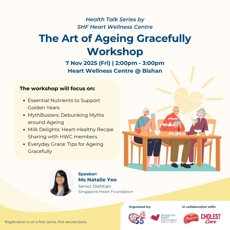 Join our Senior Dietitian, Ms Natalie Yeo, for a practical and empowering workshop dedicated to your golden years. We’ll debunk common aging myths, uncover the essential nutrients that fuel vitality and share heart-healthy recipes you can easily make at home.