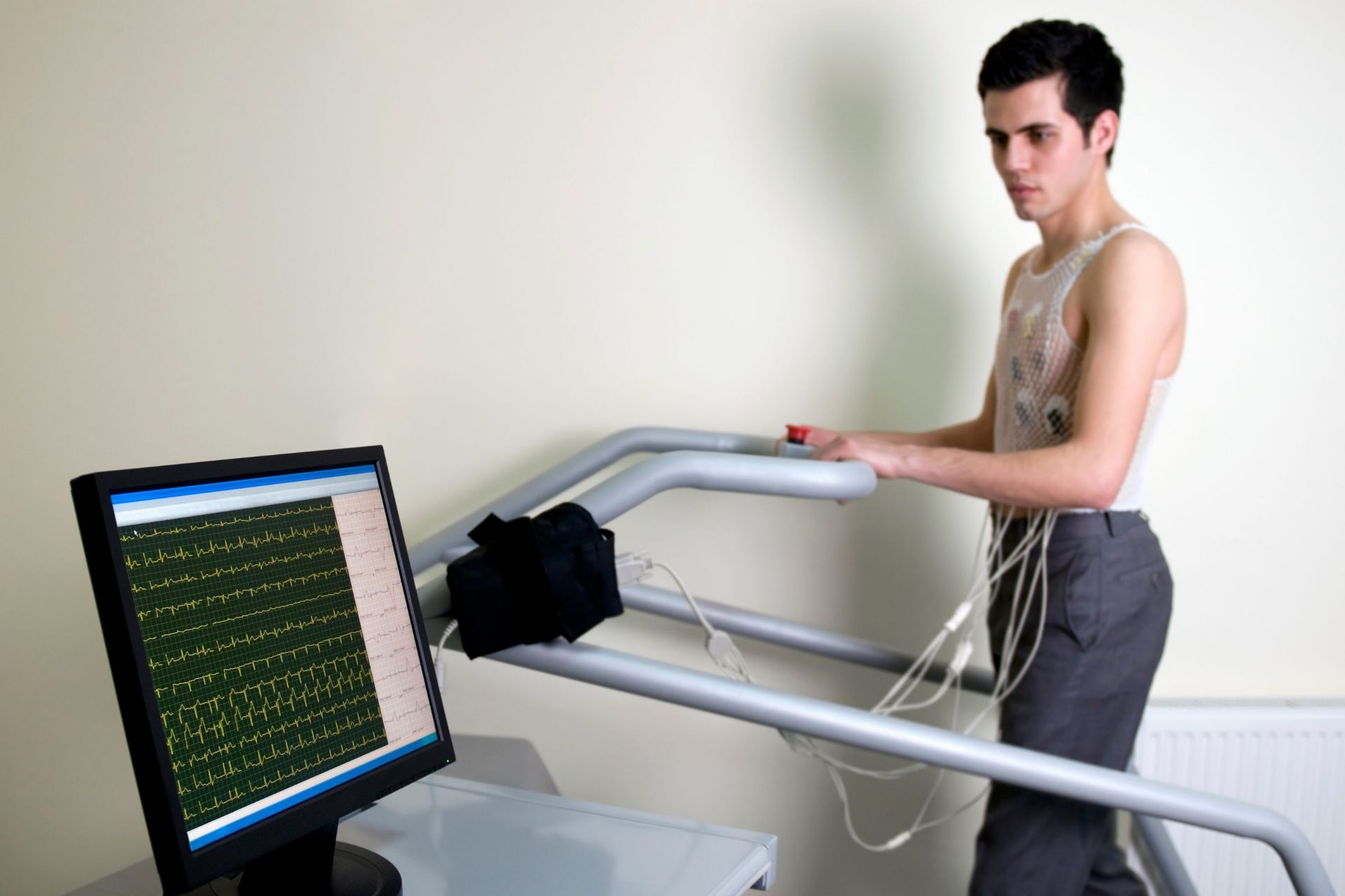 Typically, the patient will run on a treadmill wearing the usual ECG electrodes. Recordings are taken simultaneously at 3-minute intervals, with the speed and elevation of the treadmill increasing gradually. This will continue until his/her target exercise heart rate is reached or the patient develops chest pains and is unable to continue with the test.