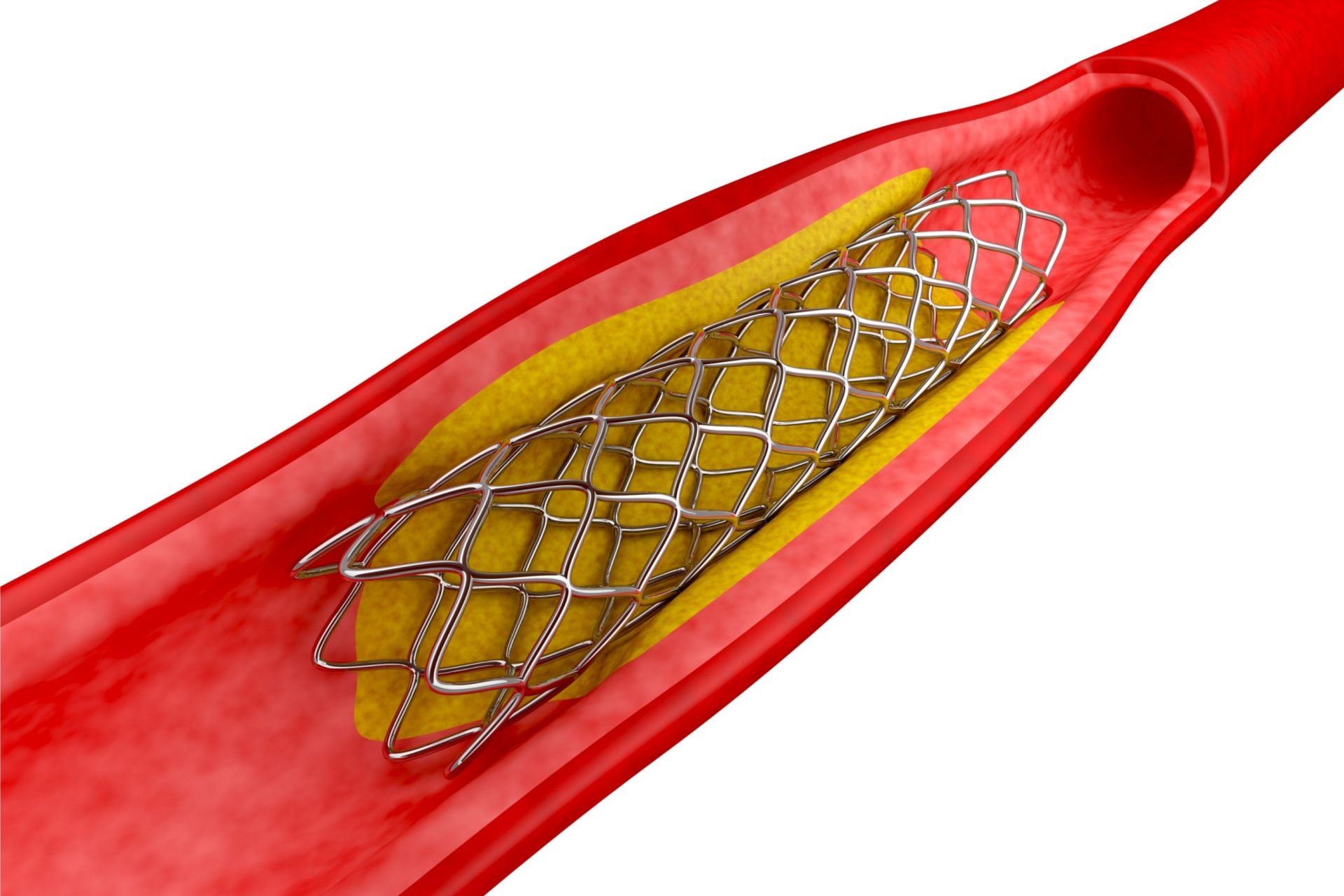 A stent, in the form of an expandable metal coil or mesh, is placed on an angioplasty balloon and guided to the blockage (similar to PTCA). The angioplasty balloon is then inflated to stretch open the stent and implant into the walls of the blocked artery.