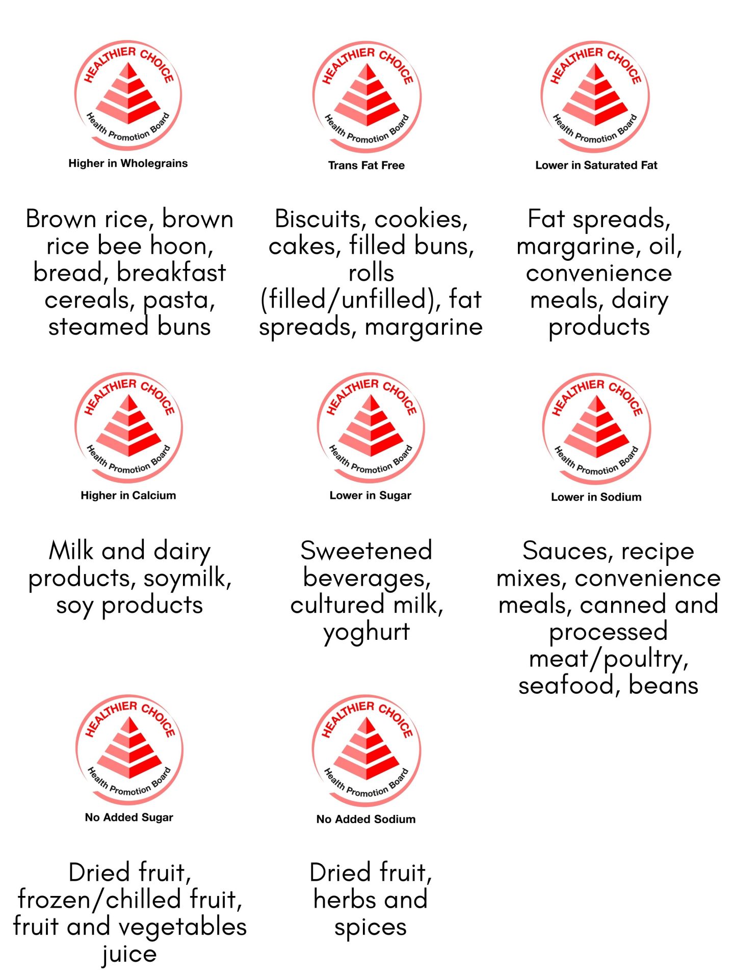 The Healthier Choice Symbol is awarded to products that meet the nutritional standards set by the Health Promotion Board. Products with the HCS symbol are lower in saturated fat, sodium and sugar. It also includes products higher in whole-grains, dietary fibre and calcium compared to similar products in the same food category. Products with the “Trans Fat free” logo contain no or negligible amount of trans fat (less than 0.5g per 100g of the product).
