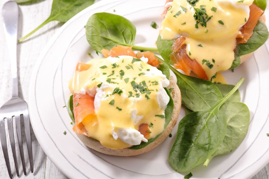 Salt is used in English muffins for flavour enhancement, and to provide a chewier texture. There is a good mixture of melted butter, egg yolk and salt to create a smooth and creamy hollandaise sauce. Salt is used in the curing process of bacon and to enhance flavour and preservation.