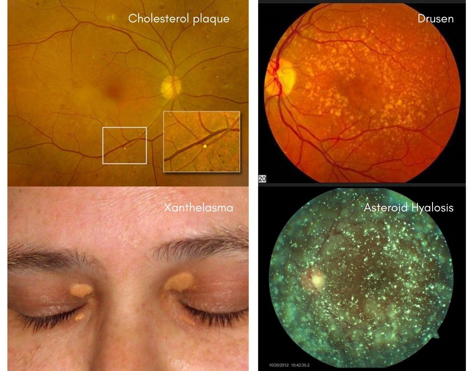 Cholesterol may also appear in other forms in other parts of the eyes. It may appear as drusen (yellow deposits under the retina) in those with age-related macular degeneration, as asteroid hyalosis (cholesterol crystals floating within the eyeball that manifest as floaters), as greyish-white rings around the black of the eyes (called arcus senilis), and as xanthelasma which appears at the corners of the eyelids. All these signs are hints that cholesterol levels in our body are high and signal a need to cut down on a fatty diet!