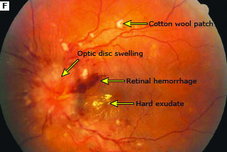 Kinking of retinal blood vessels or very tortuous blood vessels can be clues that there is underlying hypertension. The size, calibre and wall of the blood vessels are also indicative signs of the presence of high blood pressure. In severe cases of high blood pressure, there may be swelling of the optic nerve (also termed papilloedema) with widespread haemorrhages (bleeding) and cotton-wool spots (signifying oxygen deprivation) in the retina. These changes are reversible if blood pressure can be lowered to ideal levels.
