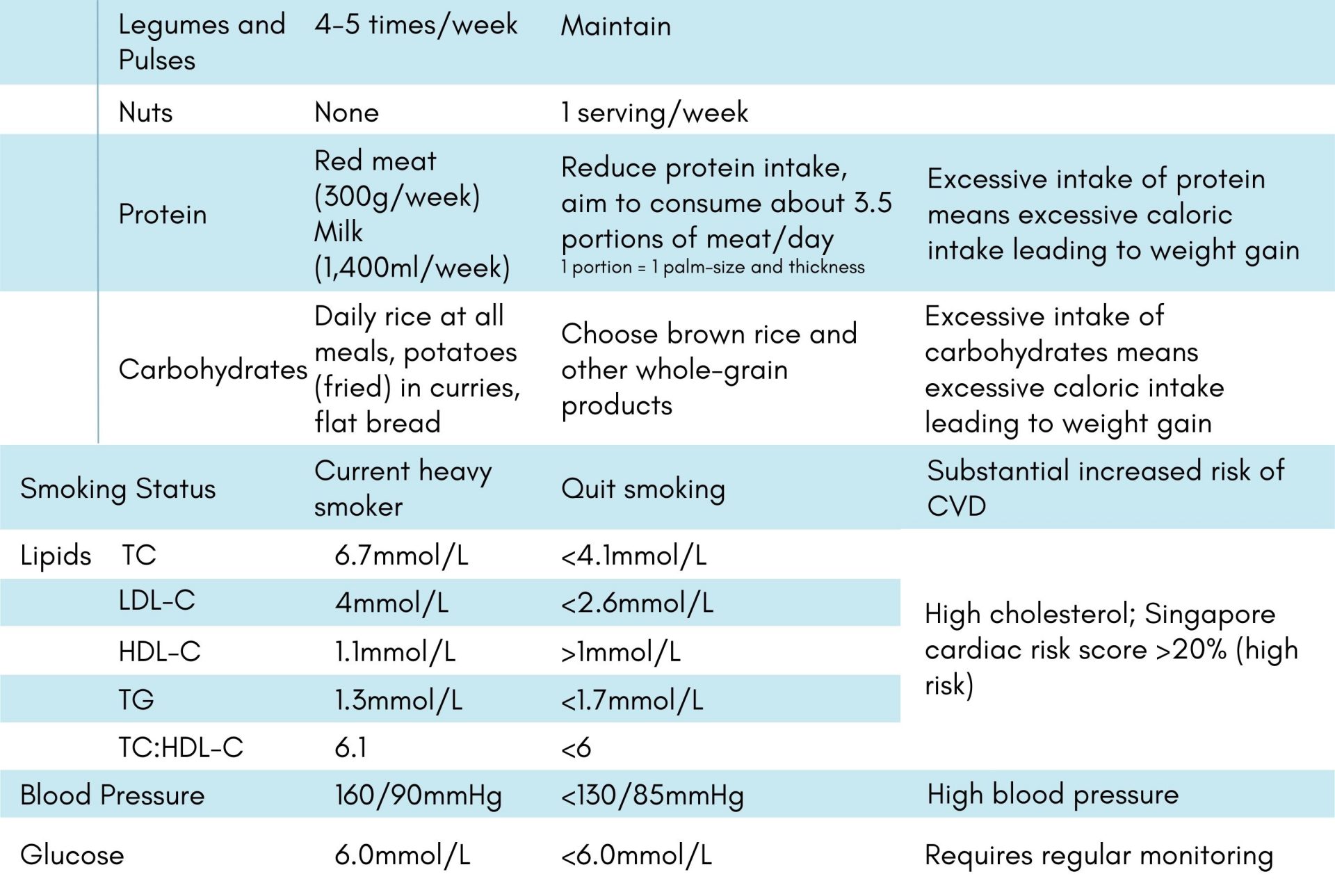 In order to understand the concept of preventive cardiology better, we will use a case study to illustrate how it works. Mr A is an overweight 60-year-old Singaporean Indian man. He is a heavy smoker, has high blood pressure, high cholesterol levels and a positive family history of heart disease (refer to Tables 1 & 2). Mr A is a full-time school attendant who walks about 6,000 steps per day.