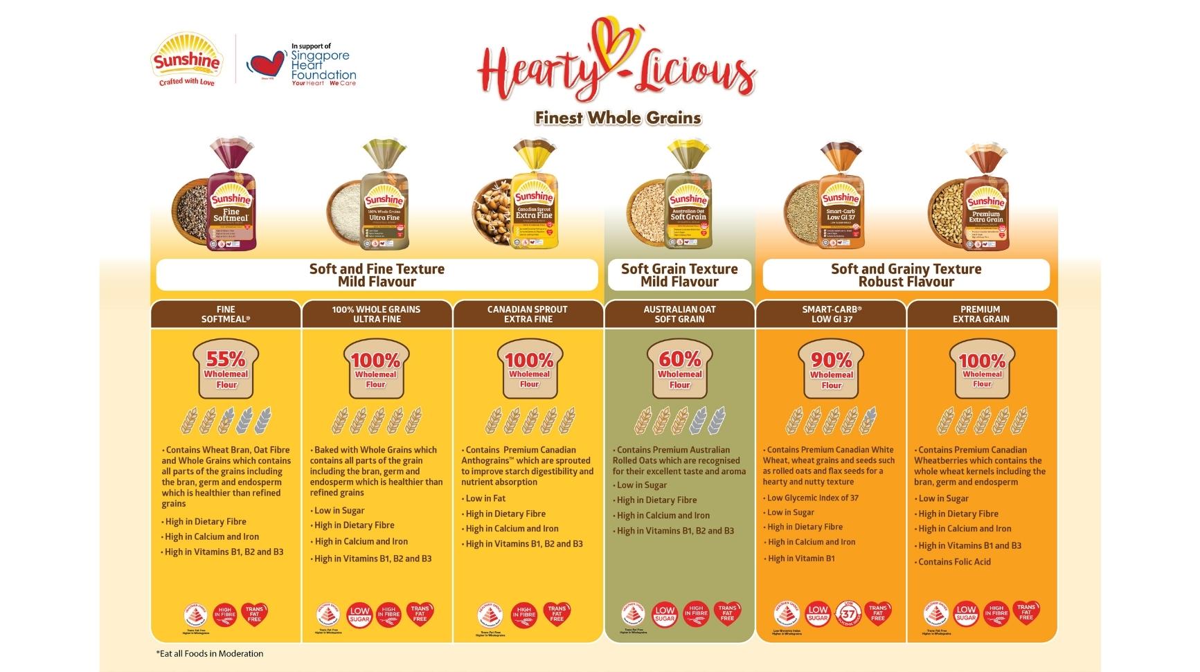 Make the switch to whole-grains today to reap their heart health benefits and become a stronger and healthier you! Check out Sunshine’s Hearty-licious bread range below and pick the wholemeal bread that will meet your daily nutrition needs: