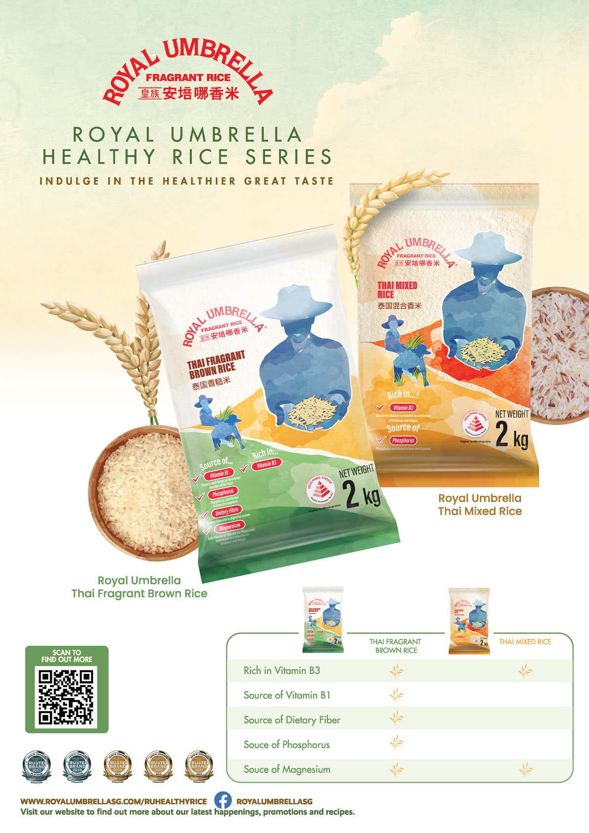 Royal Umbrella Thai Fragrant Brown and Mixed Rice (Mixture of Fragrant white, brown and red rice) encompass high nutritional values for our daily meals. During the rice process, only the hull is removed thus, retaining the nutrient-packed bran and germ. As a result, the Royal Umbrella Healthy Rice series extend from not just dietary fibre but to other important sources of vitamins and mineral that are beneficial for our daily consumption and both are also endorsed with the healthier choice logo.