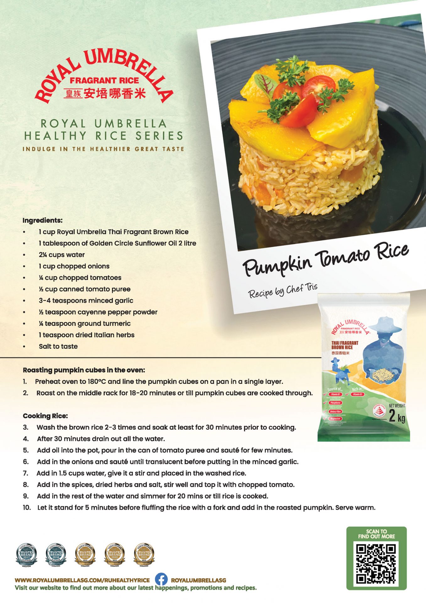 Since its first introduction into Singapore’s market in 1986, Royal Umbrella remains the favourite choice of rice brand among Singaporeans. Having brought many families from all walks of life together at the dining table, it is highly favoured for its intoxicating aroma, soft and fluffy texture. Royal Umbrella takes pride in delivering high quality rice through its advanced technology and stringent procedures. Every grain is carefully cultivated by farmers who work closely with a team of trained rice specialists. Royal Umbrella differentiates itself by conducting proper harvesting techniques and using the most advanced technologies in its field. Royal Umbrella has been awarded the annual Reader’s Digest Trusted Brands for 18 years running – from 2004 to 2021.