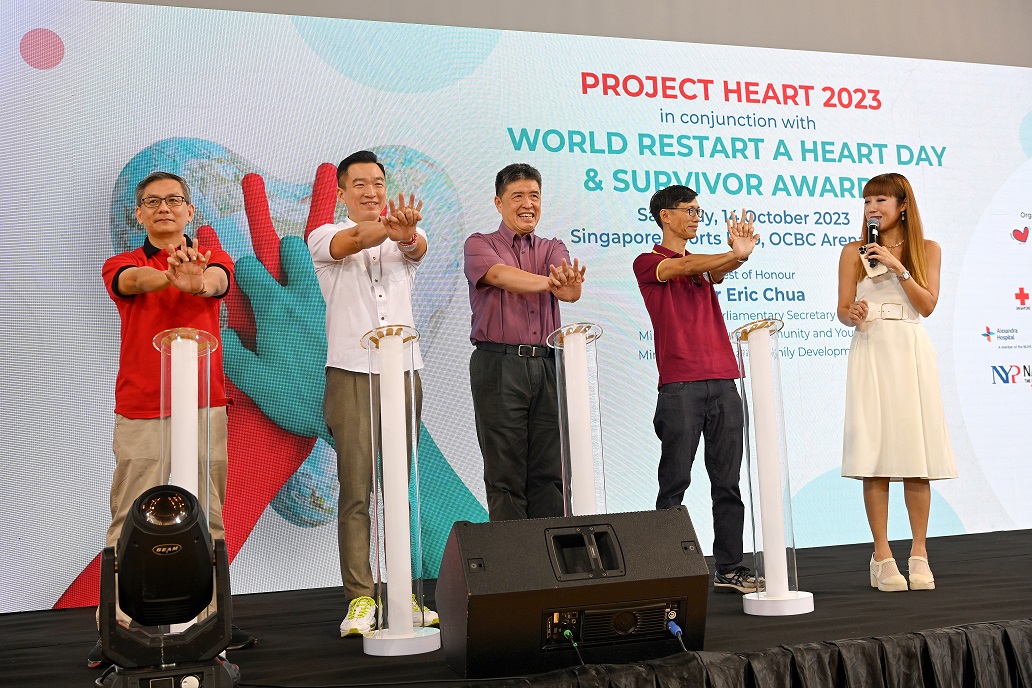 Singapore, 14 October 2023 – In a powerful demonstration to mark World Restart a Heart Day, celebrated every year on 16 October, the Singapore Heart Foundation (SHF) empowered over 1,000 participants to save a life at its fully-subscribed, highly anticipated annual event, Project Heart today. Held at the Singapore Sports Hub, the event included students and teachers from 13 schools and members of the public who signed up to be CPR+AED certified. The event was graced by Guest of Honour, Mr Eric Chua, Senior Parliamentary Secretary for Culture, Community and Youth of Singapore.