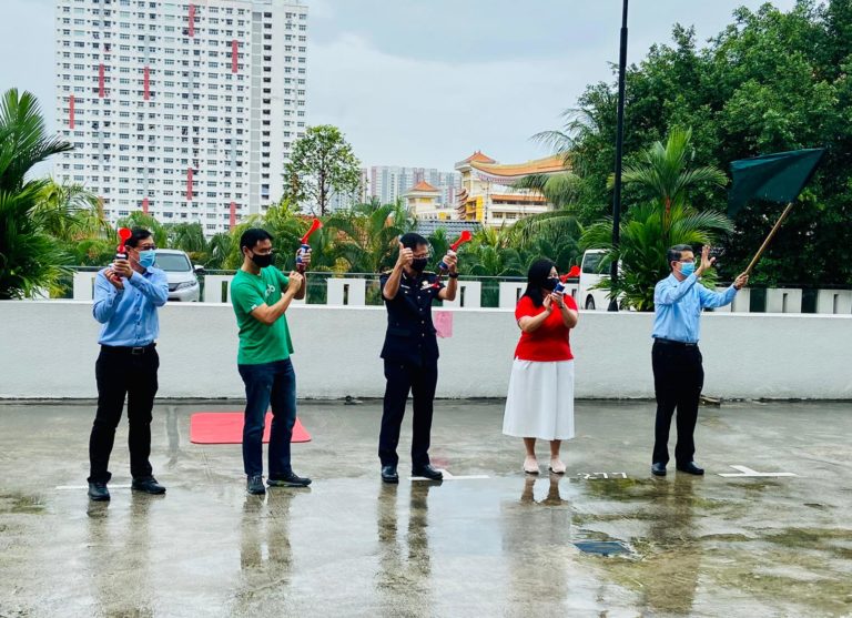 GOH flagging off the ComfortDelGro vehicles, signifying the launch of the SCDF-ComfortDelGro AED on Wheels Programme