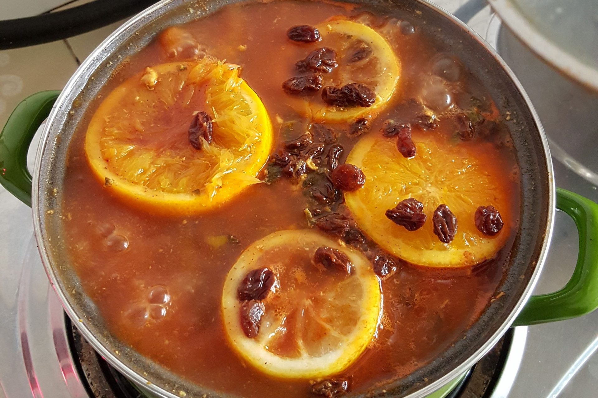 - Combine the tomato paste, broth, pumpkin, honey and cinnamon in a pot (big enough to add in the chicken) and bring it to a simmer.