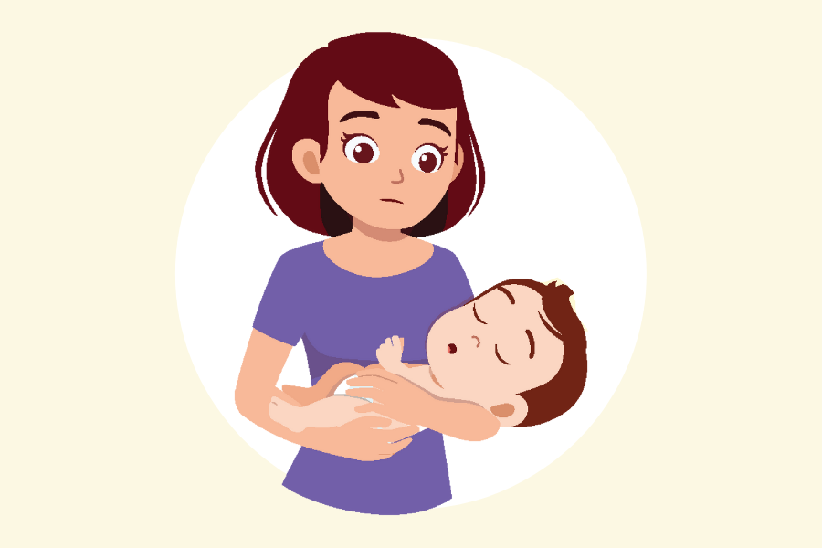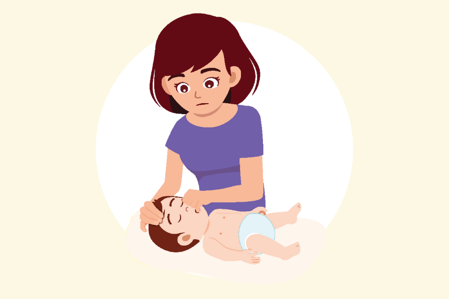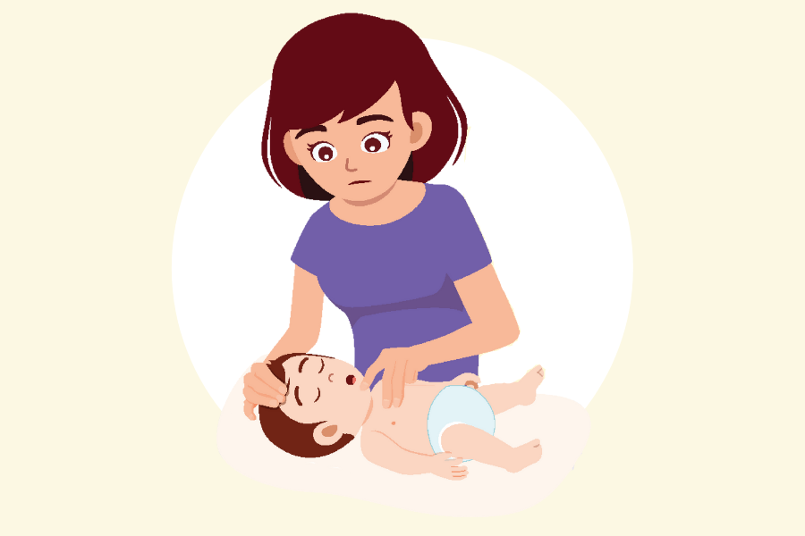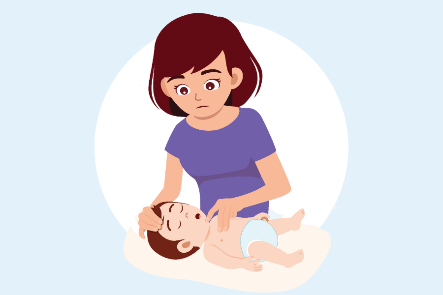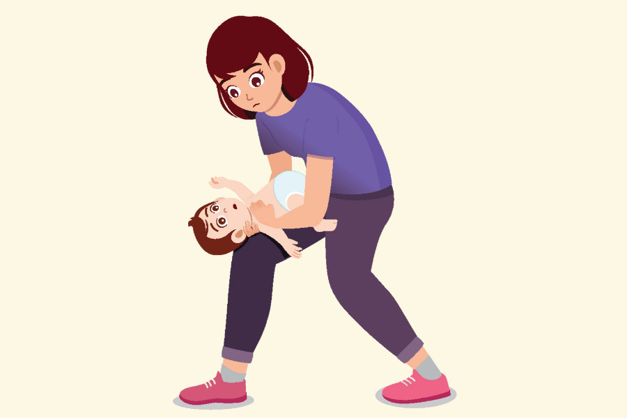 Support the infant’s head and neck with your palm and his/her chest with your forearm. Rest your forearm on your thigh. Ensure that the infant’s head is lower than his/her chest.