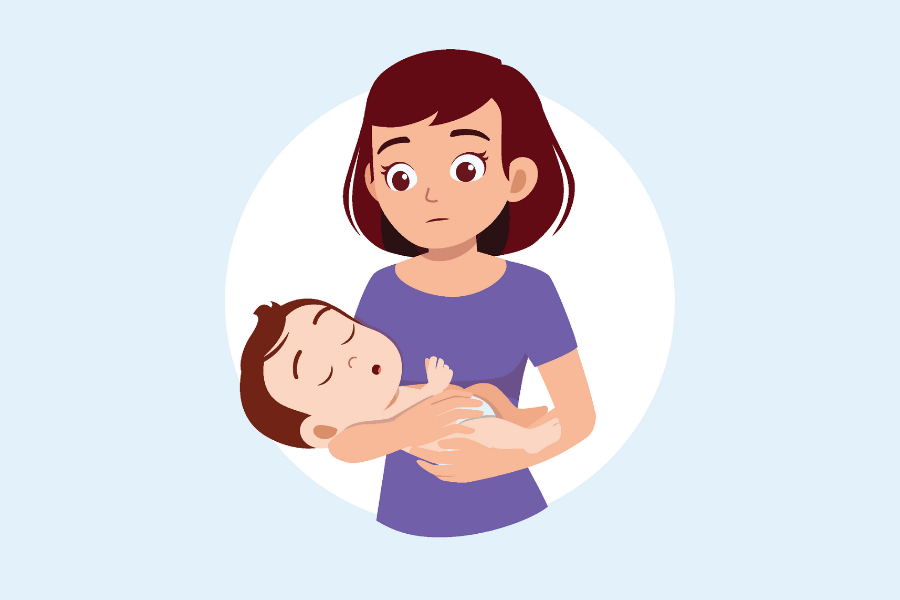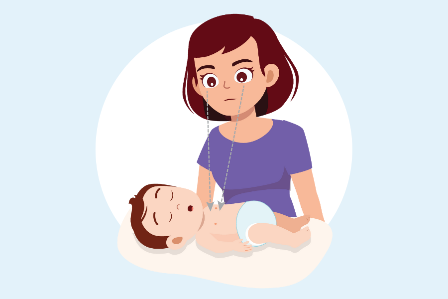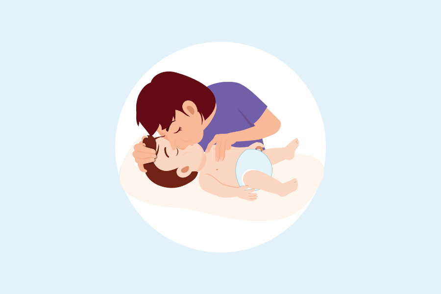 Turn the infant on his/her back. Support his/her back with your forearm and rest your forearm on your thigh.